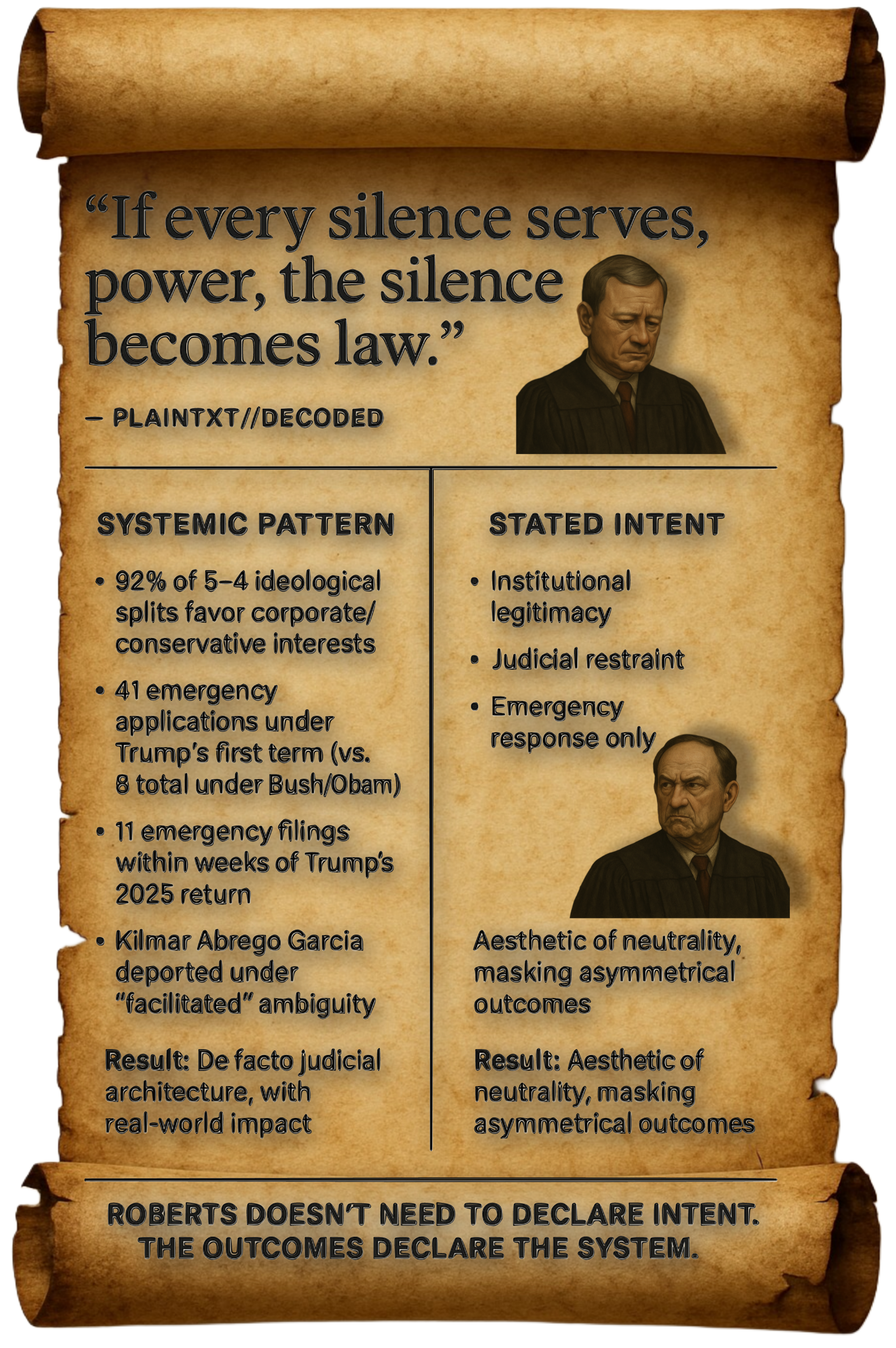 Every silent acquiescence to Trump’s shadow decrees widens the legitimacy gap between Court and country. By shielding the Court from transparency and dissent, Roberts has not protected the institution—he has allowed it to be captured.